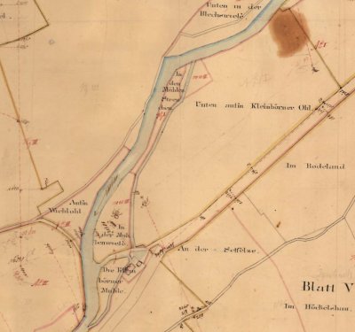 Im Rheinisch-Westfälischen Urkataster wurde die Mühle 1832 als „Kleinbörner Mühle“ in der Flur XXVII, Wiehlpuhl erfasst. Die scheint wohl ein Fehler des Verfassers gewesen zu sein, denn in der beachbarten Flur Bergerhof heißt der dazugehörige Weiler „Im Kleeborn“.